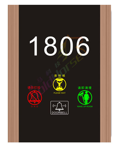 GHD-R05帶房號五合一門外顯示器(方形A5系列)置于客房門口,可定制房間號,并以圖標(biāo)加中英文的形式顯示“請勿打擾”、“請即清理”、“請稍候”狀態(tài)。 其中“有/無人”狀態(tài)通過門鈴隱含顯示。門外顯示器的顏色和外觀也可以根據(jù)酒店方要求進行定制。